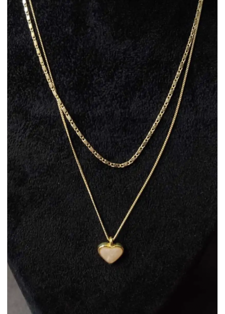Zarif kalp figürü ve şık çift zincir tasarımıyla öne çıkan bu kolye, günlük kombinlere feminen ve modern bir dokunuş katar.