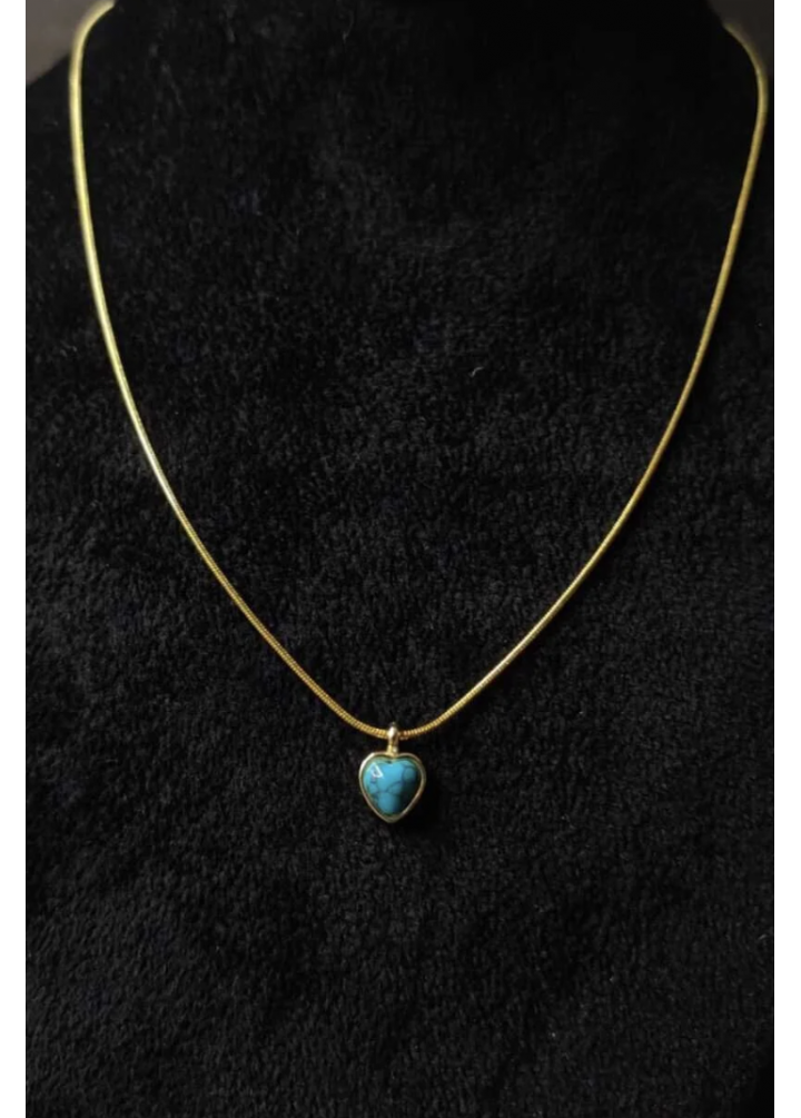 Canlı turkuaz kalp taş detayıyla öne çıkan bu minimal kolye, ince zincir yapısı sayesinde boyunda zarif ve sade bir duruş sunar.