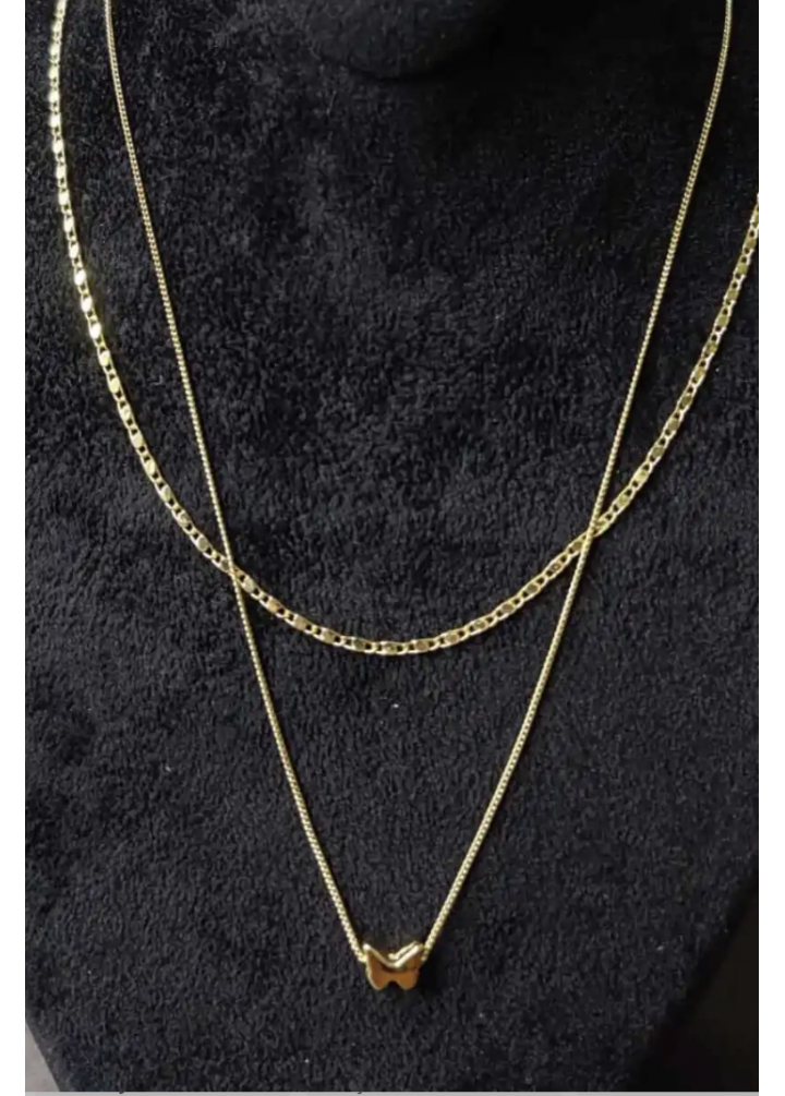 Zarif kelebek figürü ve iki farklı zincirin uyumuyla tasarlanan bu kolye, feminen ve şık bir görünüm sunar. Gold ton rengi sayesinde hem günlük hem de özel kombinlerde rahatlıkla kullanılabilir.