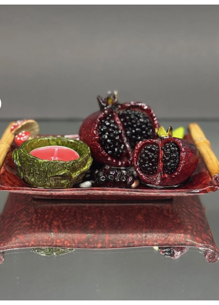 Nar figürlü dekoratif mumluk, yaşam alanlarınıza sıcak ve estetik bir atmosfer kazandırır. El yapımı olarak polyester malzemeden üretilmiş olup, detaylı nar figürleri ve tabak formundaki tasarımıyla öne çıkar. Tealight mumlar ile uyumludur. Salon, masa üstü, kafe ve hediye amaçlı kullanım için idealdir. (Mum dahildir)