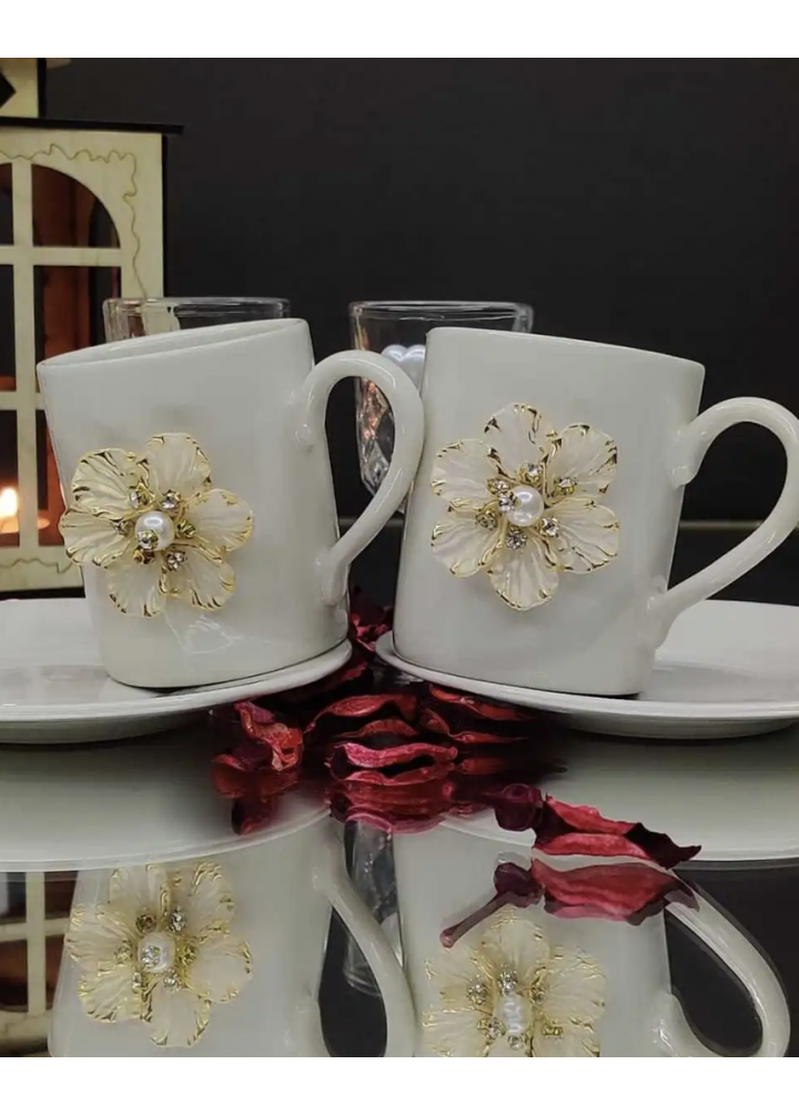 Çiçek varak detaylarıyla tasarlanan bu porselen kahve fincanı takımı zarif ve şık bir sunum sağlar Özel tasarım çiçek figürü ve inci görünümlü detayıyla sofralara estetik bir dokunuş katar Günlük kullanıma ve misafir sunumlarına uygundur Zamansız tasarımıyla her ortama uyum sağlar Ürün Özellikleri Ürün tipi Porselen kahve fincanı Set içeriği 2 adet kahve fincanı 2 adet fincan tabağı Renk Beyaz Detay Çiçek figürlü varak dekor Kullanım Günlük ve misafir sunumları Stil Zarif dekoratif Önemli Bilgilendirme 2 Lİ TAKIM OLARAK SATILMAKTADIR KAHVE YANI DAHİL DEĞİLDİR GÖRSELLER TEMSİLİDİR RENK TONLARI IŞIĞA GÖRE FARKLILIK GÖSTEREBİLİR