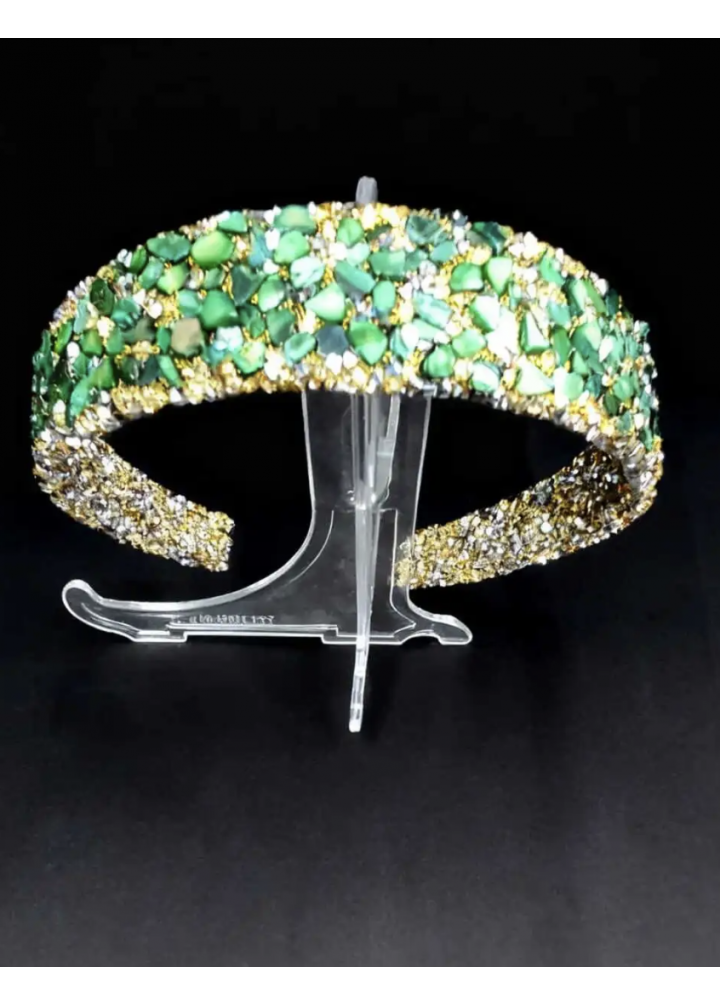 Yeşil taşların doğal ve asil görünümünü, altın tonlu zeminle birleştiren bu geniş taşlı taç, güçlü ve dikkat çekici bir şıklık sunar. El işçiliğiyle hazırlanan taş dizilimi sayesinde ışığı zarif bir şekilde yansıtır ve saç üzerinde dolgun, gösterişli bir duruş oluşturur. Özel günlerde fark yaratmak isteyenler için ideal bir aksesuardır.